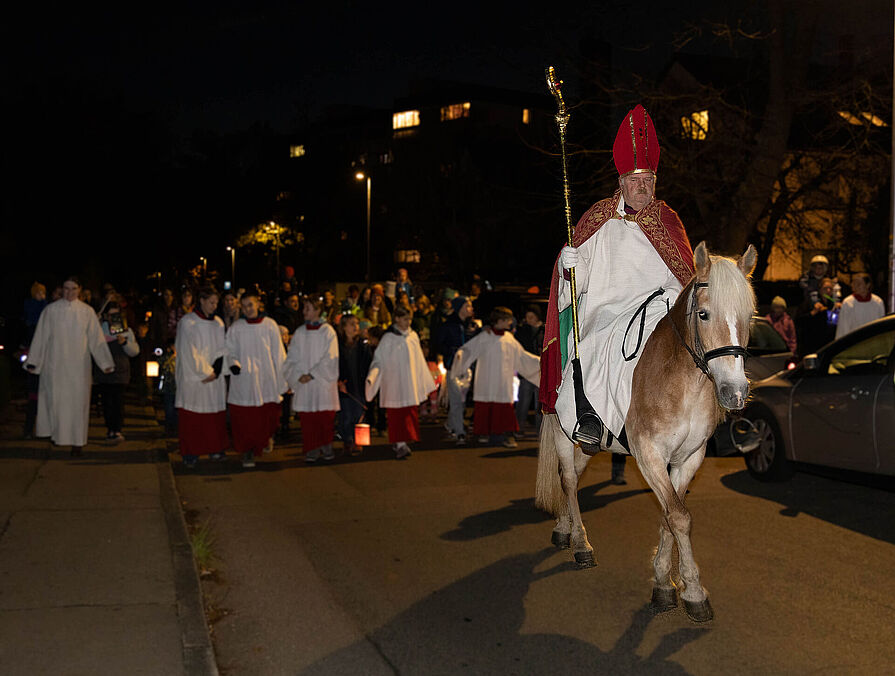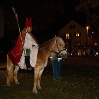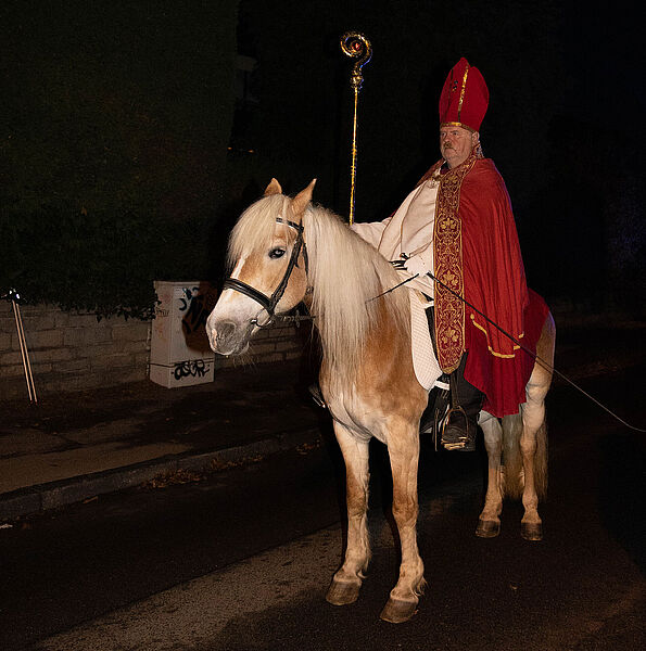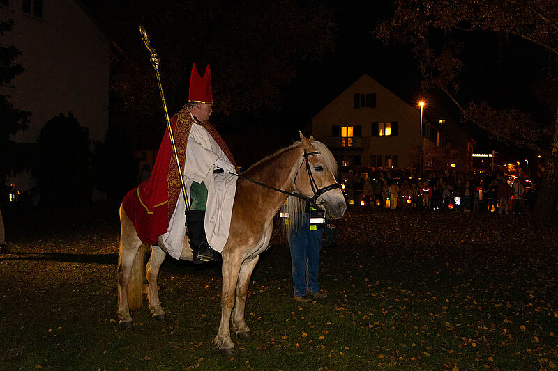 Nach der Martinsgeschichte in der Kirche zogen Kinder, Eltern und Familien mit ihren bunten Laternen – angeführt von St. Martin auf seinem Pferd – durch die Straßen. Der Posaunenchor Heumaden sorgte dabei für die musikalische Begleitung.